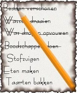Ik ben van de lijstjes. Nee niet altijd, zo geplanned ga ik nu ook weer niet met mijn leven om. Alleen op dagen dat ik veel te doen heb, maak ik de avond tevoren een lijst. Daar probeer ik dan alles zo op te schrijven, dat het op volgorde afwerken, het meest efficient is. Als ik mijn vertrouwde lijstje niet heb, maak ik er een puinhoop van. Halverwege een klus bedenk ik, dat er nog iets anders moet gebeuren en wel nu !! Niet dat ik nu een ADHDer ben, want ik kan uren tekenen, zonder dat ik aan eten of drinken denk, het allang donker geworden is in huis en het ver voorbij een gezonde bedtijd is. De lijstjes zorgen er wel voor dat ik mijn hoofd bij de kerntaken houd en het afvinken van gedane zaken, geven me gewoon een goed gevoel. Vandaag ging het werk ook weer als een speer, alleen tijdens het boodschappen doen, dacht ik “oh verdorie, helemaal de zak met plastic afval vergeten mee te nemen” maar ja het stond dan ook niet op mijn lijstje.